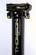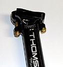 ReviewsThomson Masterpiece seatpostBy John Stevenson At a fairly astounding 157g for the 27.2mm, 240mm road bike version, Thomson's Masterpiece seatpost is one of the lightest we've seen without getting into the realms of hyper-expensive carbon exotica. As in Thomson's regular seatpost the shaft and lower cradle are made in one piece and there's a two-bolt clamp to hold your saddle rails gently but firmly in place. The Masterpiece saves weight over Thomson's standard post by machining away all unnecessary material, as well as Thomson's ingenious shaping of the inside of the shaft. Instead of a circular internal cross-section, the Masterpiece is reinforced at the front and back, and has thin walls at the sides. Thomson usually achieves this by extruding the post; the Masterpiece is machined to its final dimensions, which Thomson claims allows closer tolerances than extrusion alone. In its other details, the masterpiece is identical to Thomson's popular Elite post. The two-bolt clamp allows for very fine adjustment of the saddle angle, a decided advantage over most single-bolt designs which sometimes just won't give you exactly the angle you want. As with the Elite, two versions are available: with a straight shaft and with a slightly bent shaft. Because Thomson puts the clamp in line with the shaft, the straight version puts the saddle further forward than most seatposts; the bent post moves it back into what, for most of us, is the right place. However, the Thomson setback design doesn't provide an unusual amount of layback: riders looking to get well behind the pedals on a standard frame will need to look elsewhere or go custom. Given its asking price of $139 you'd be silly to lob a Masterpiece on any old bike (as this writer did to try it out -- it's probably worth as much as the rest of my commuting hack put together) but as the finishing touch to a top-end, super-light machine it'd be a perfect choice. Price guide: $139 (USD) |